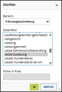 Hinter dem Punkt Datenfeld verbergen sich die Felder aus DYNAREX. Diese sind in verschiedene Bereiche gegliedert, um die Auswahl zu erleichtern.