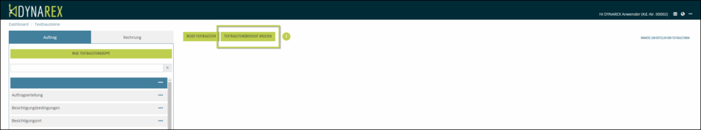 Im oberen Bereich finden Sie den Button TEXTBAUSTEINÜBERSICHT DRUCKEN (1).