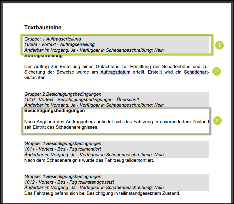 Direkt darunter finden Sie den Inhalt des Bausteines (2). Datenfelder werden blau hinterlegt dargestellt (3).