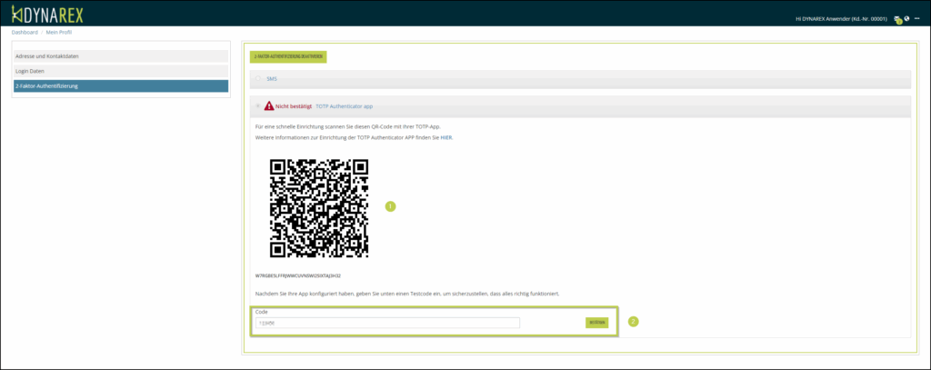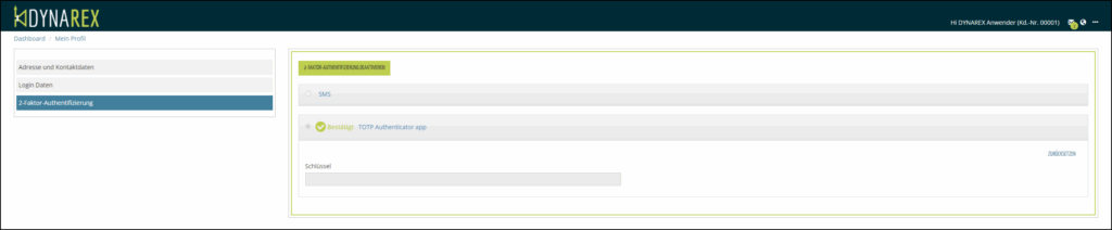 Ab sofort werden Sie bei der Anmeldung in DYNAREX, egal ob Browser oder App, nach der Eingabe des Passwortes zur Eingabe des 6-stelligen Authentifizierungscodes aufgefordert.