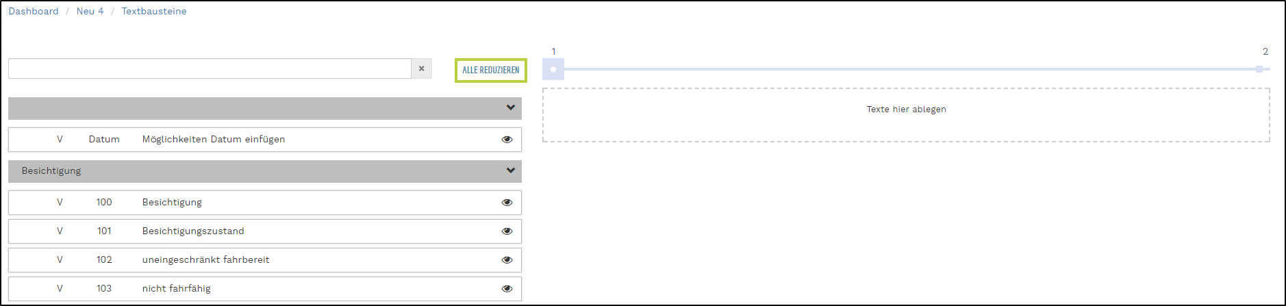 Mit dem Button ALLE REDUZIEREN werden auf der linken Bildschirmseite alle Text-Gruppen minimiert.