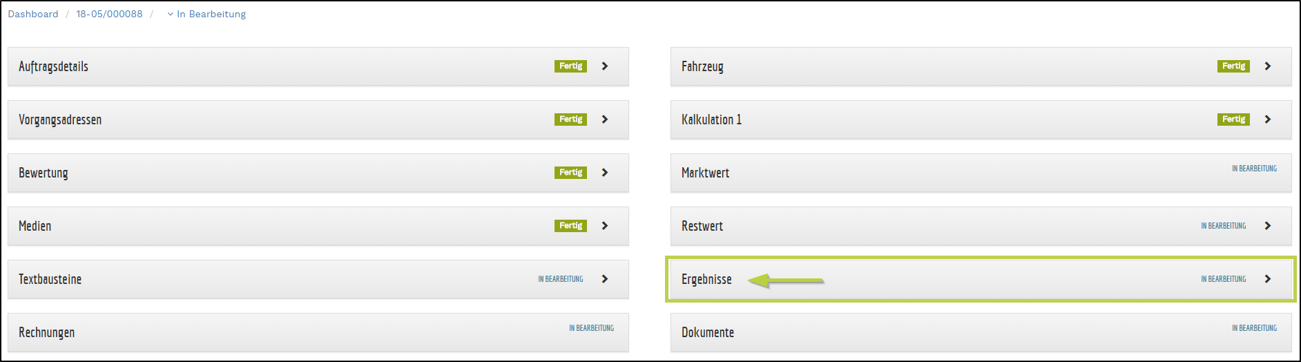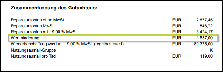 Somit wird der ermittelte Minderwert in die Seite Ergebnisse übernommen: