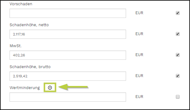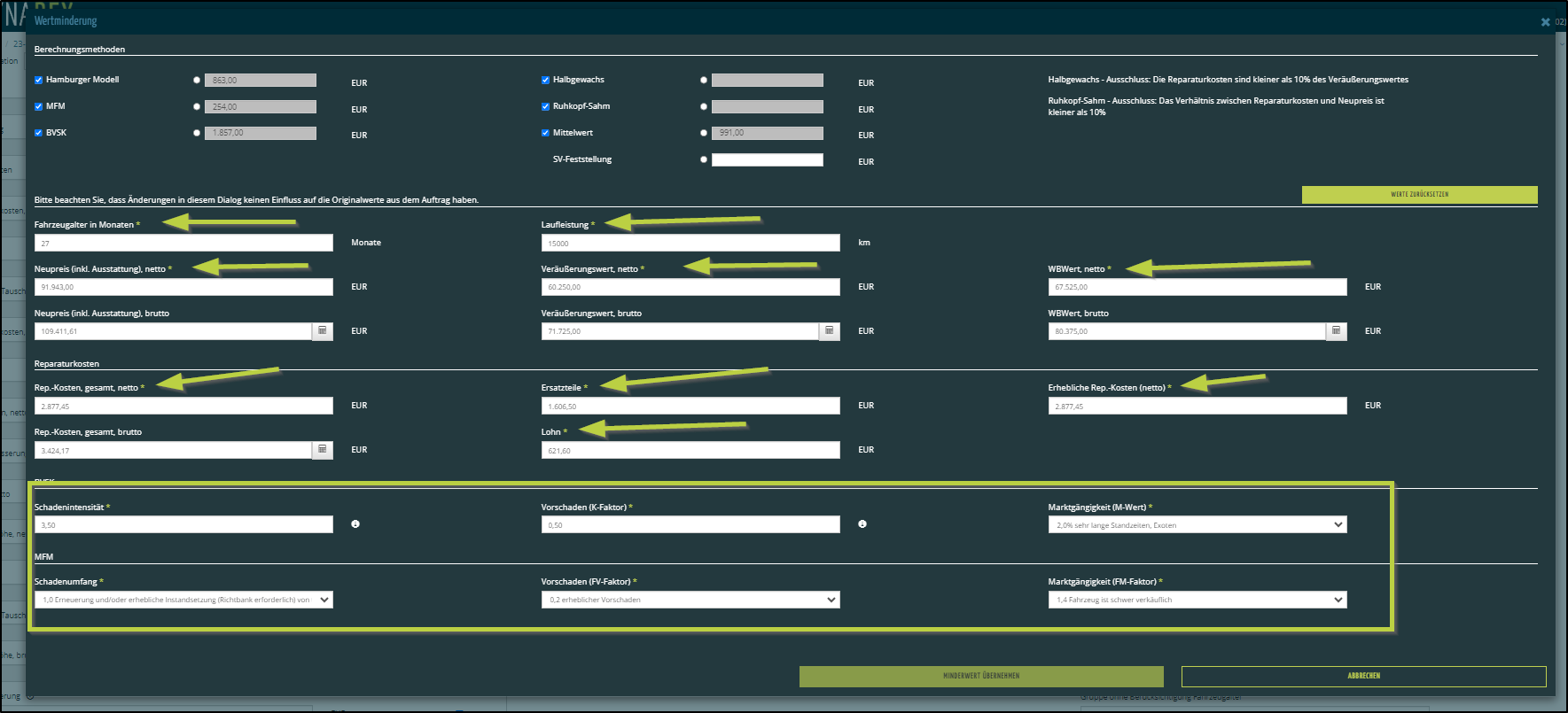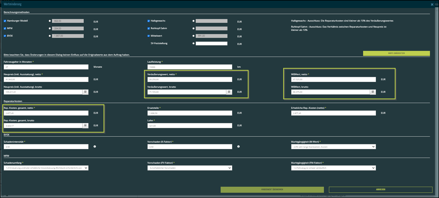 Die bereits ermittelten Werte wie Reparaturkosten, Wiederbeschaffungswert etc. werden in dem Dialog automatisch ausgefüllt, jeweils mit Brutto und Netto.