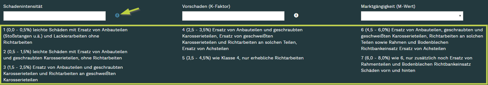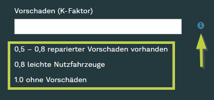 Über die Info-Button bei Schadenintensität und Vorschaden (K-Faktor), erfahren Sie zu den Datenfeldern weiteres zur Dateneingabe: