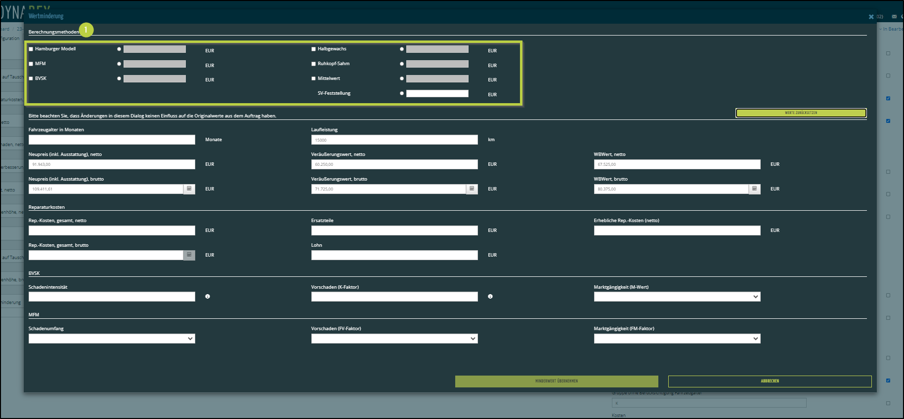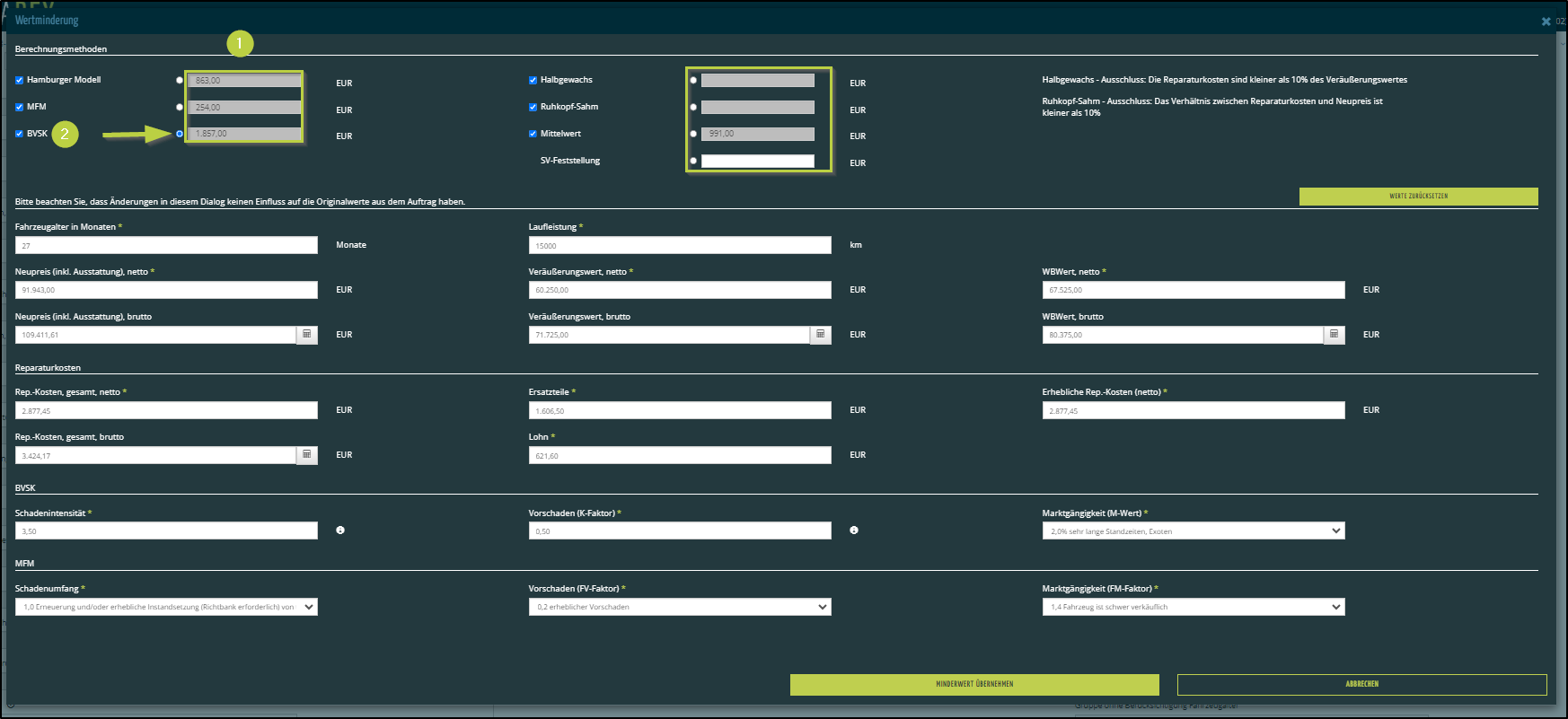 In dem Bereich Berechnungsmethoden (1) aktivieren Sie die gewünschten Methode(n), welche in die Berechnung des Minderwertes einbezogen werden sollen.
