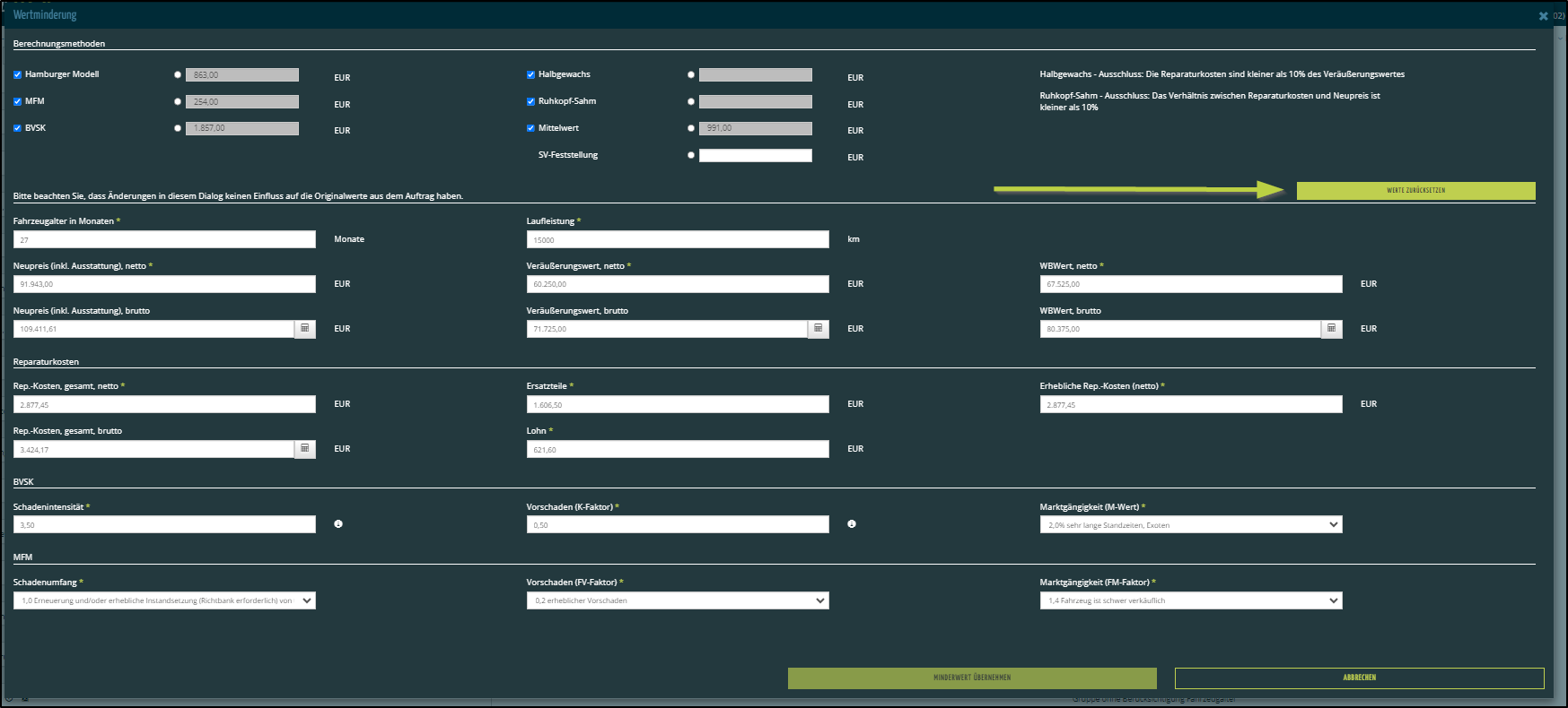 Sollten Sie den Dialog schon einmal aufgerufen haben, bevor Sie z.B. den Wiederbeschaffungswert ermittelt haben, können Sie beim erneuten Aufruf der Maske den Button „Werte zurücksetzen“ nutzen, damit sich das System alle aktuellen Werte zieht.
