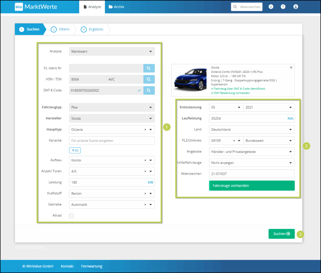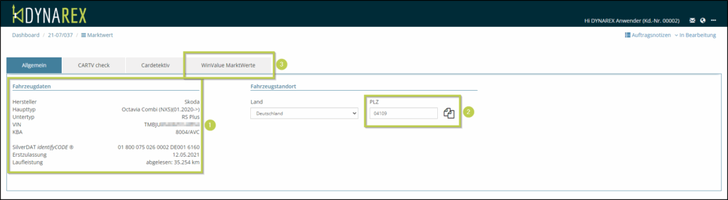 Die Fahrzeugdaten mit Ausnahme der VIN werden übermittelt und dargestellt (1). Sie können die Suchkriterien anpassen (3) und über den Button (2) die Suche auslösen.