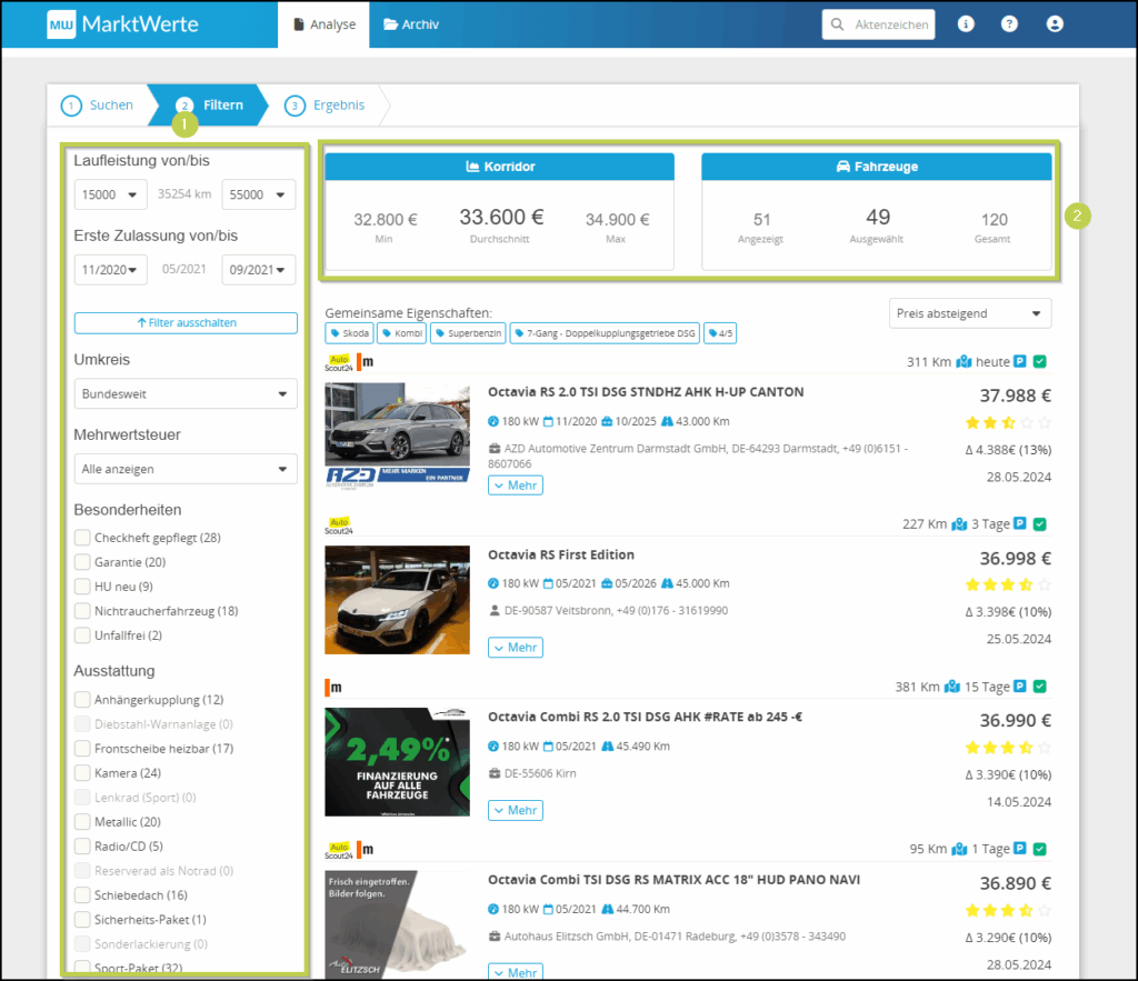 Im nächsten Tab können die gefundenen Fahrzeug gefiltert werden (1). Ebenso sehen Sie bereits einen Korridor und Anzahl der Fahrzeuge (2).