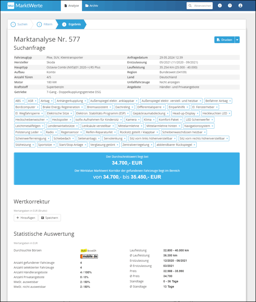 Über den Button KORRIDOR AKTUALISIERNEN (5) können Sie bis 3 Tage nach Erstellung der Marktertanalyse die Daten und Suchkriterien aktualisieren.