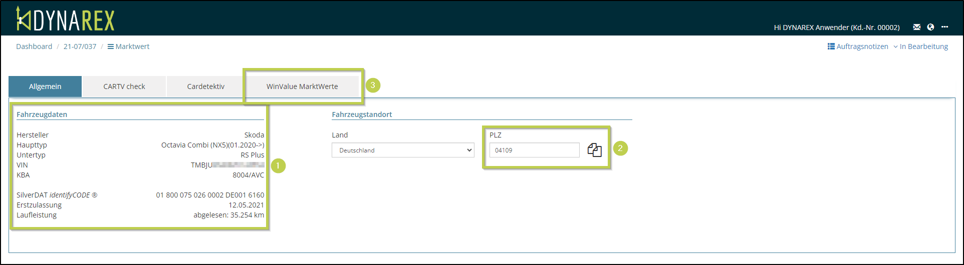Die Fahrzeugdaten mit Ausnahme der VIN werden übermittelt und dargestellt (1). Sie können die Suchkriterien anpassen (3) und über den Button (2) die Suche auslösen.
