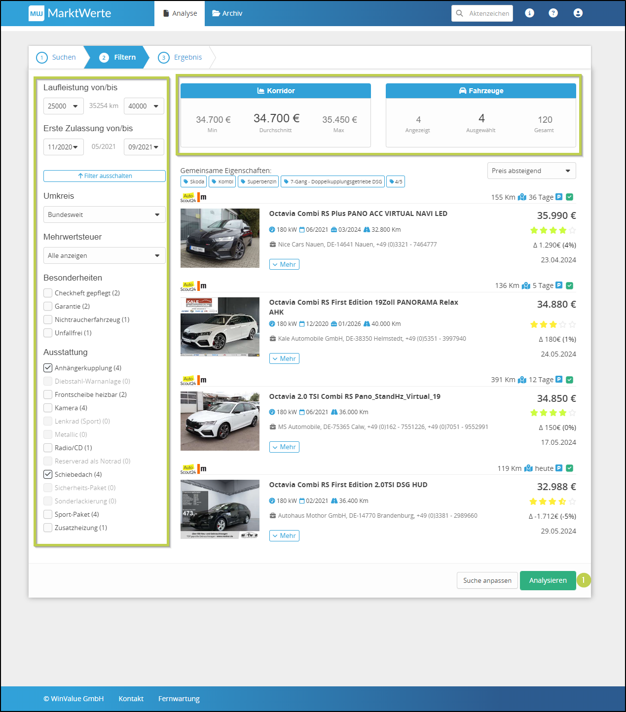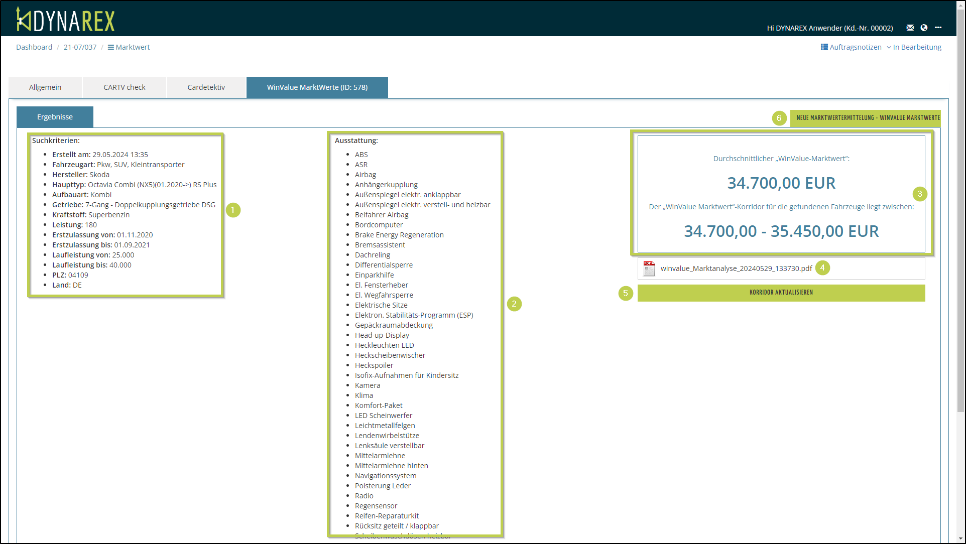 Über den Button KORRIDOR AKTUALISIERNEN (5) können Sie bis 3 Tage nach Erstellung der Marktertanalyse die Daten und Suchkriterien aktualisieren.