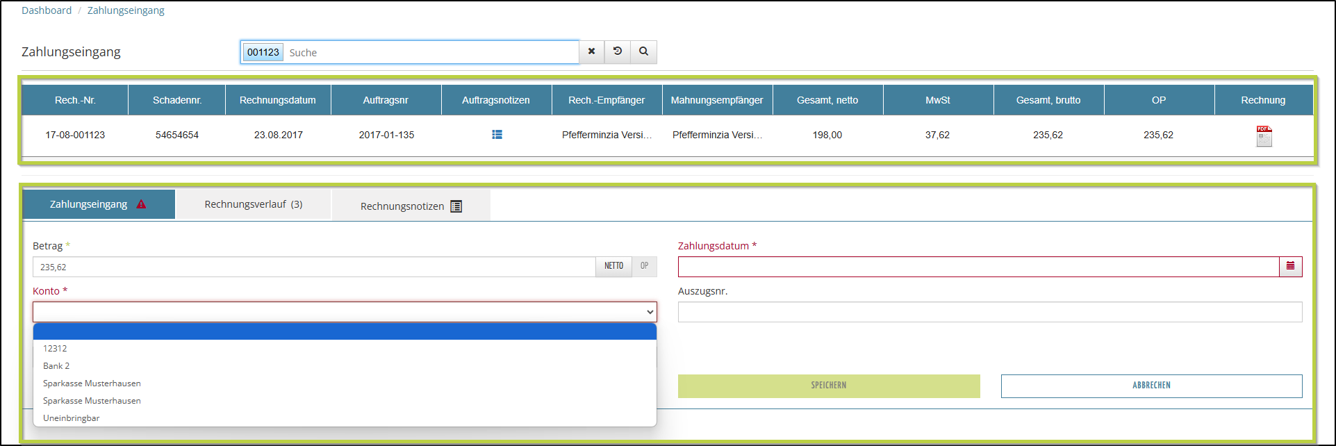 - die Rechnung wird geöffnet und Sie können den Zahlungseingang erfassen