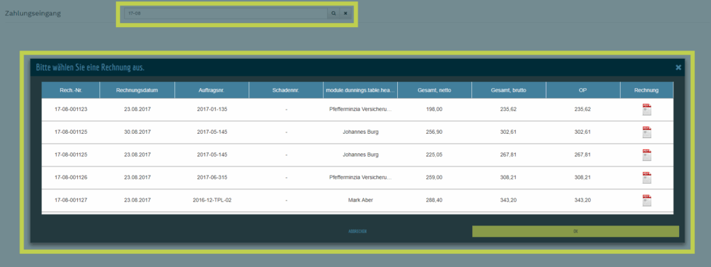 - sollte Ihr Suchbegriff mehrere Ergebnisse liefern, so müssen Sie aus dem folgenden Dialog die gewünschte Rechnung auswählen