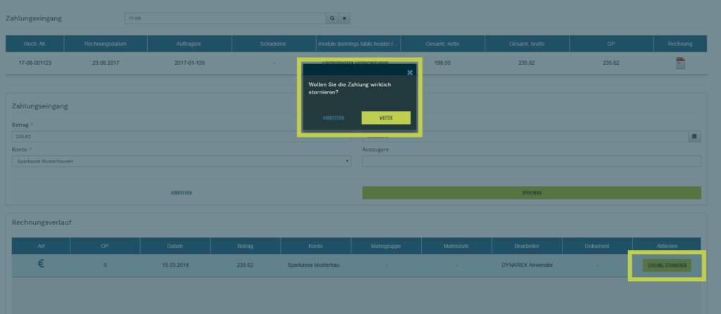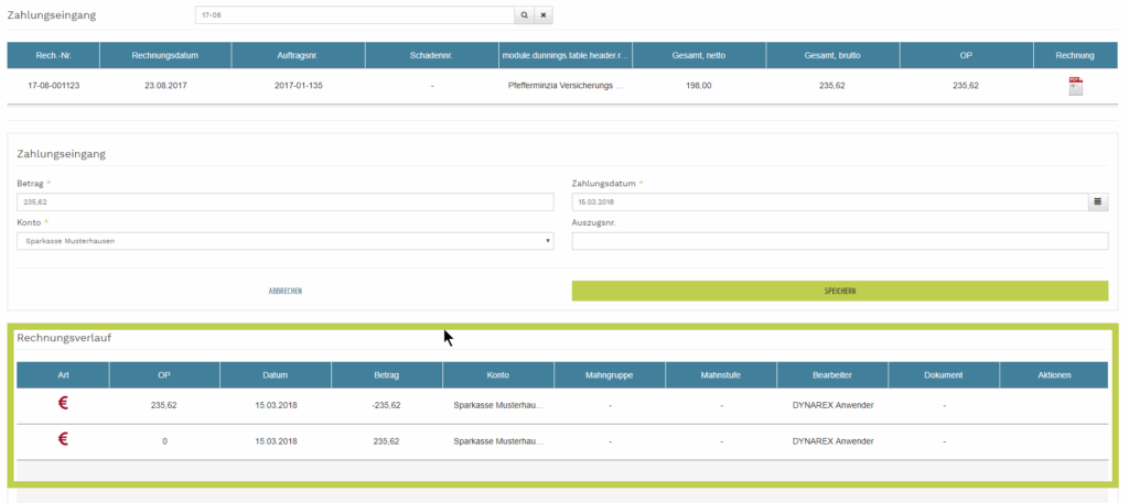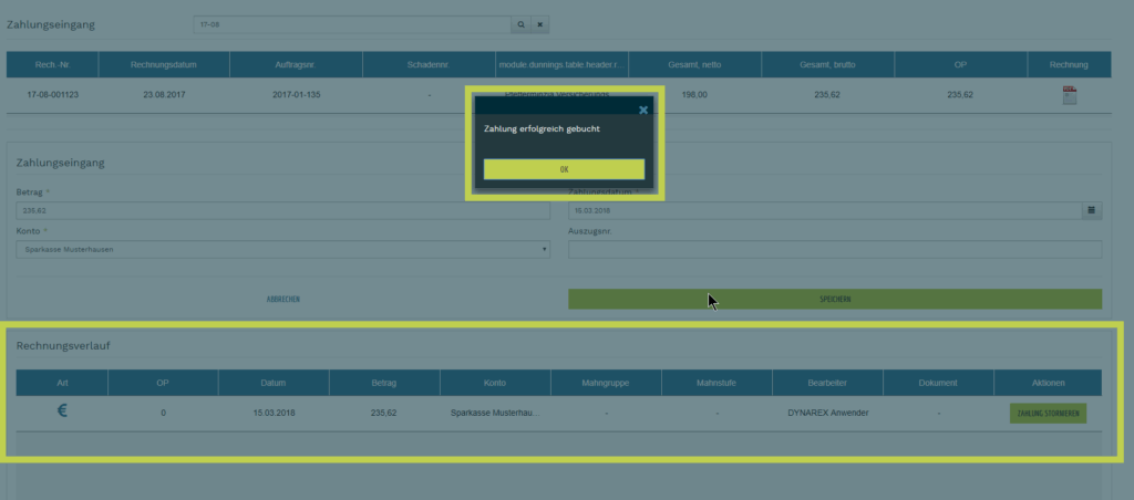 - es folgt ein Bestätigungsdialog und im Rechnungsverlauf sieht man die erfasste Zahlung