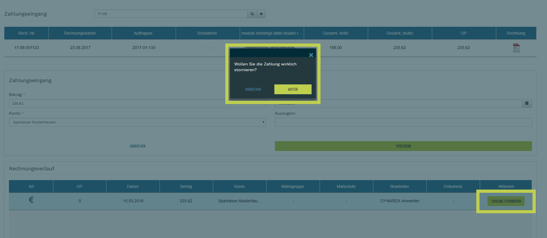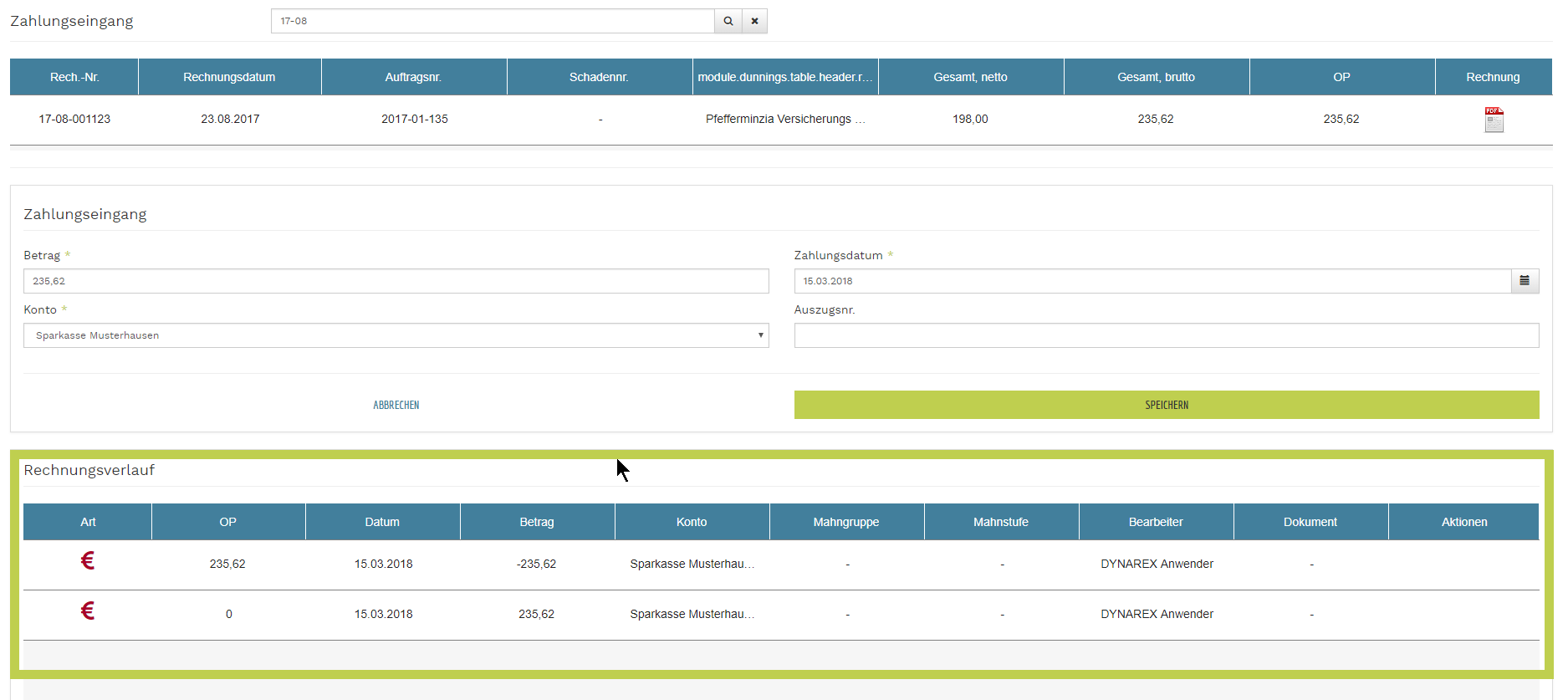- es folgt ein Bestätigungsdialog und im Rechnungsverlauf sieht man die erfasste Zahlung