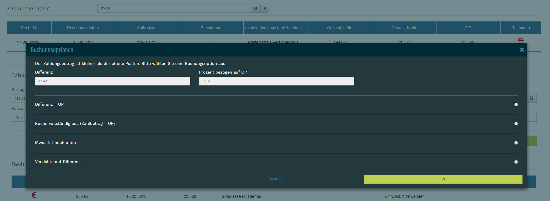 - wenn nicht der vollständige Betrag bezahlt wurde, erscheint nach dem Speichern eine Abfrage, wie Sie mit dem restlichen offenen Posten umgehen wollen. Dabei stehen mehrere Optionen zur Auswahl.