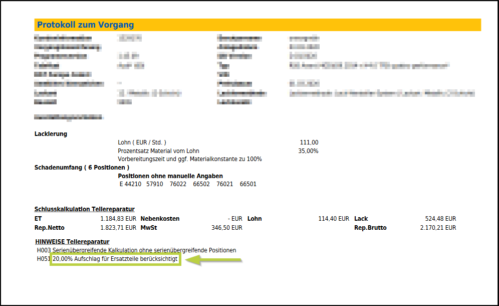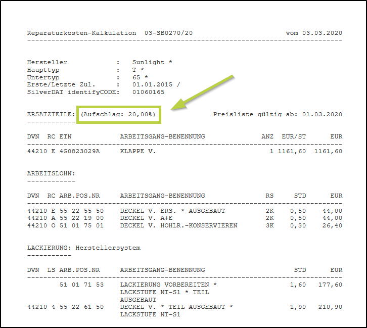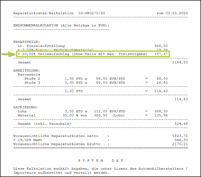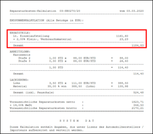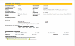 Bei dieser Variante wird im Kalkulationsreport unter der Einzelauflistung der ERSATZTEILE der Hinweis (Aufschlag: 20,00 %) bzw. (Abzug: 20,00 %) angedruckt