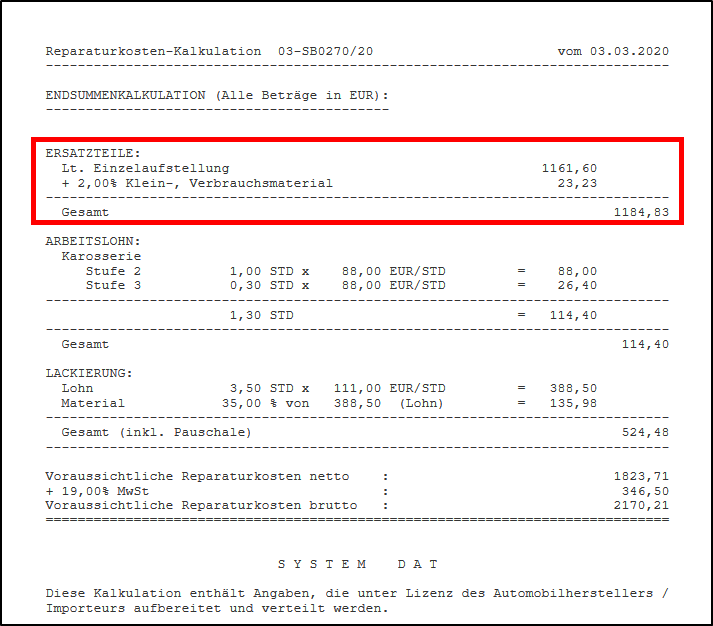 Bei dieser Variante wird im Kalkulationsreport unter der ENSUMMENKALKULATION \ ERSATZTEILE der entsprechende Wert angedruckt: